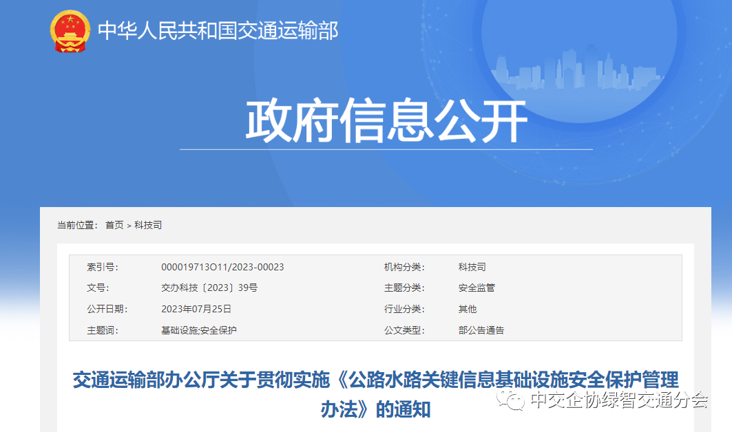 交通运输部办公厅关于贯彻实施《公路水路关键信息基础设施安全保护管理办法》的通知