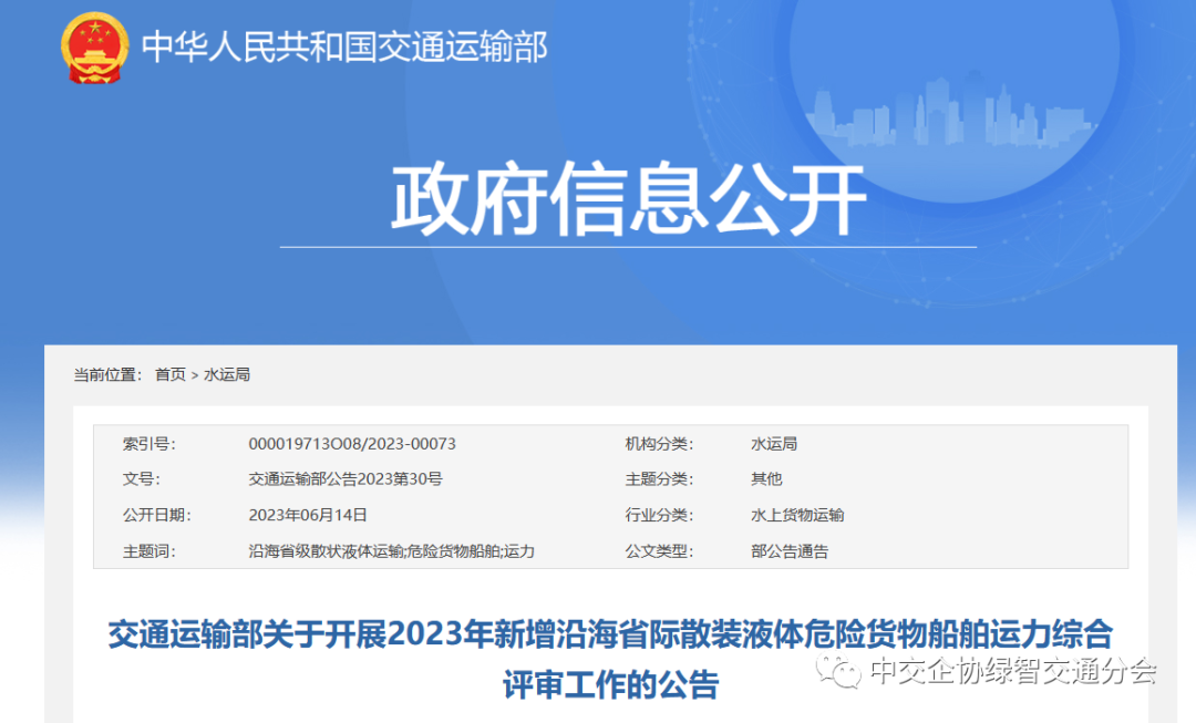 交通运输部关于开展2023年新增沿海省际散装液体危险货物船舶运力综合评审工作的公告