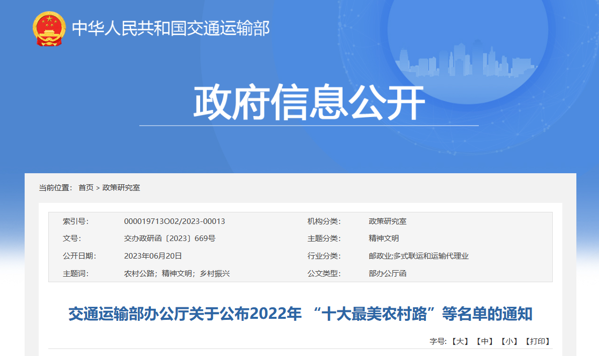 交通运输部办公厅关于公布2022年 “十大最美农村路”等名单的通知