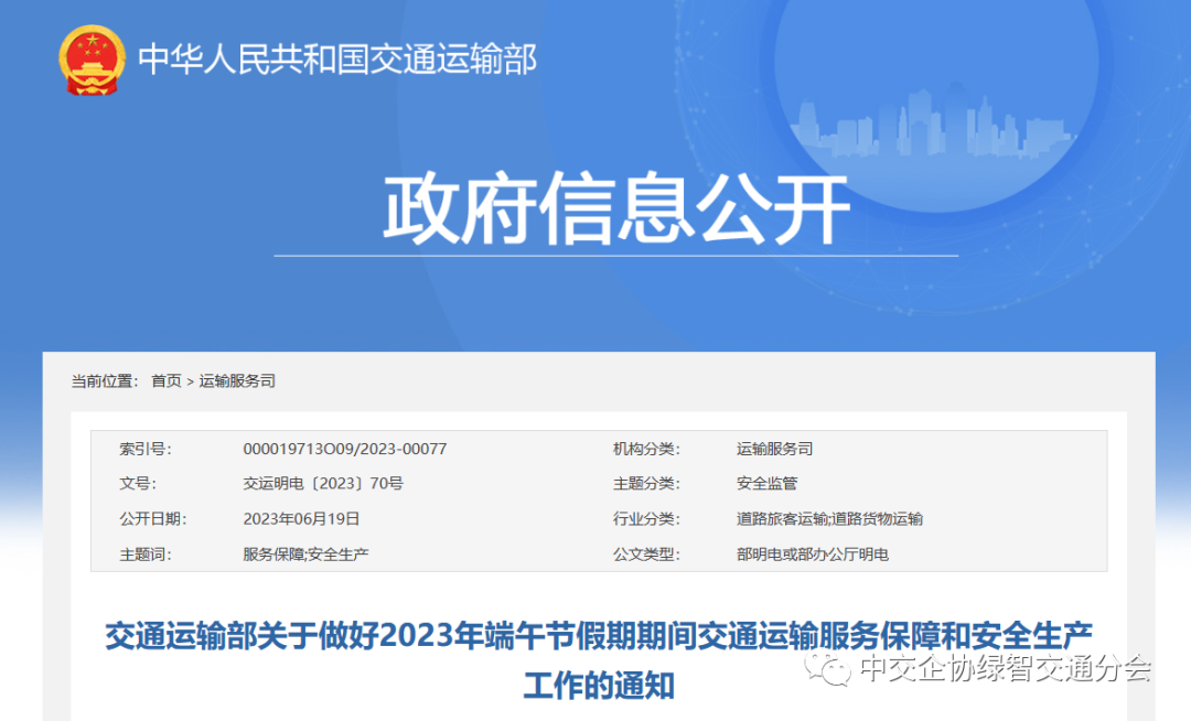 交通运输部关于做好2023年端午节假期期间交通运输服务保障和安全生产工作的通知