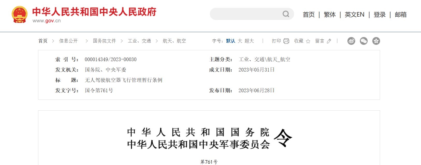 现公布《无人驾驶航空器飞行管理暂行条例》,自2024年1月1日起施行。中央军委主席习近平国务院总理李强2023年5月31…