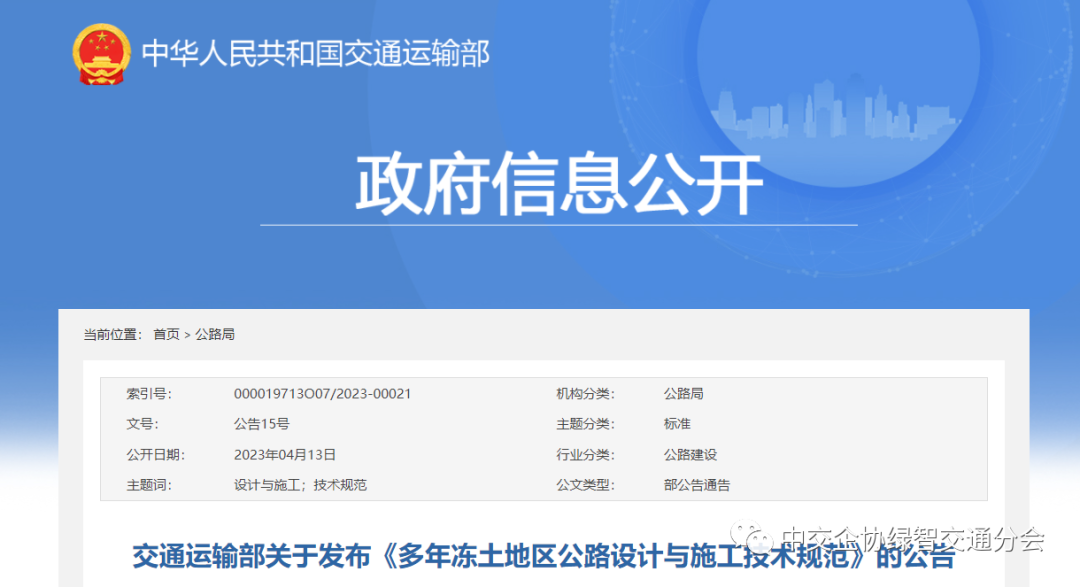 现发布《多年冻土地区公路设计与施工技术规范》(JTG/T3331-04—2023),作为公路工程推荐性行业标准,自2023年7月1…