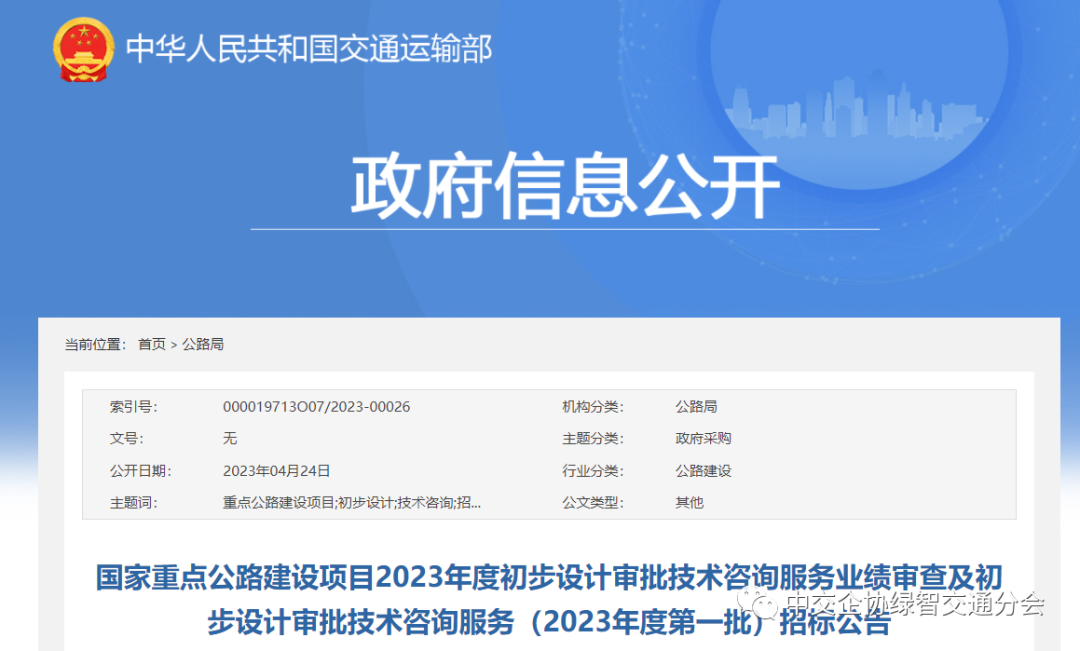 国家重点公路建设项目2023年度初步设计审批技术咨询服务业绩审查及初步设计审批技术咨询服务(2023年度第一批)招标公告