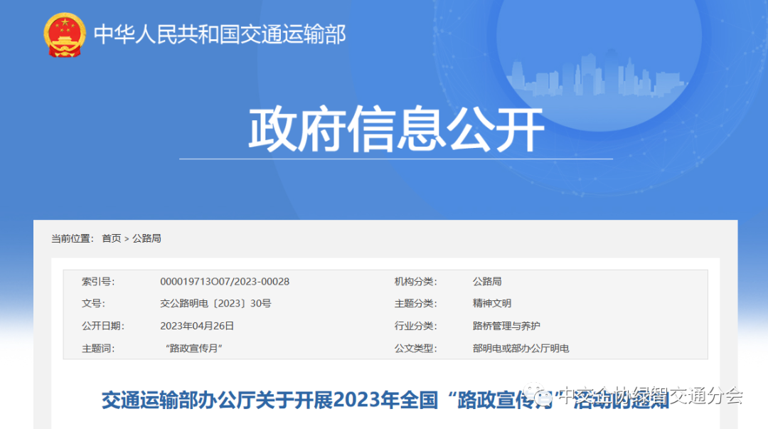交通运输部办公厅关于开展2023年全国“路政宣传月”活动的通知