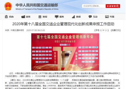 近日,中国交通企业管理协会印发《关于开展交通企业管理创新成果应用推广暨第十八届全国交通企业管理现代化创新成果申报相关工作安排的通知》(简称《通知》),对2020年第十八届全国交通企业管理现代化创新成果申报等相关工作进行安排部署。
