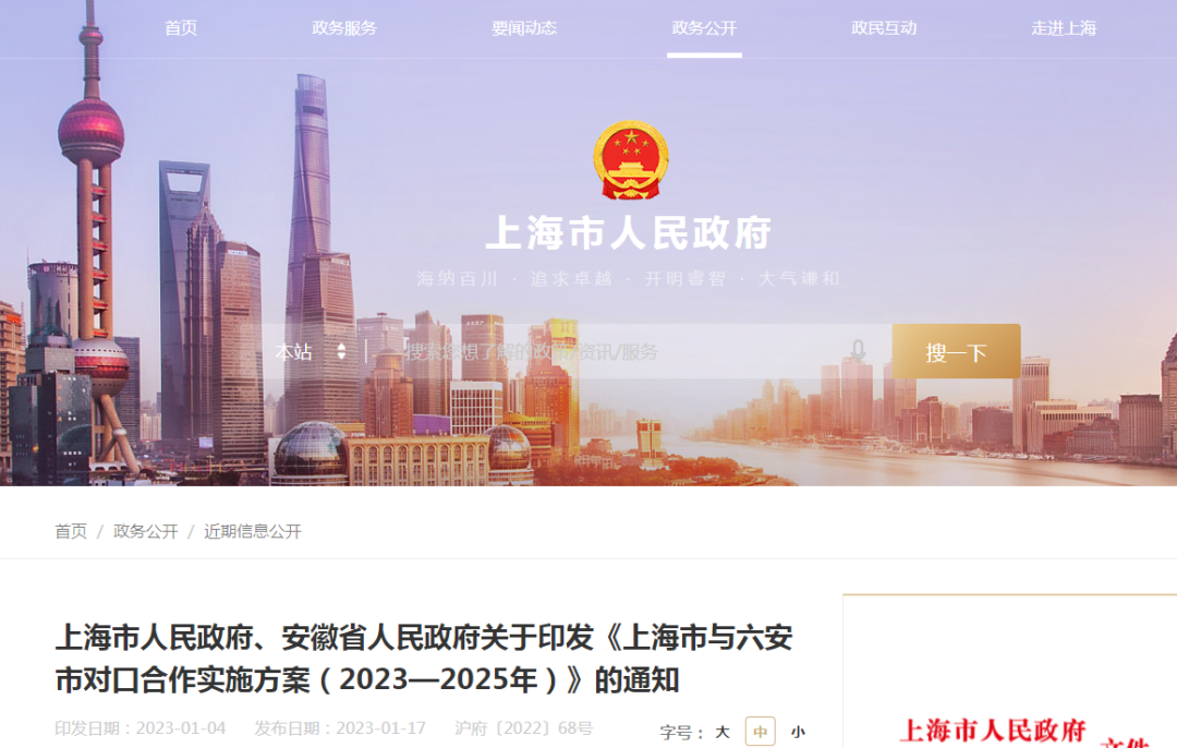 上海市人民政府安徽省人民政府关于印发《上海市与六安市对口合作实施方案(2023—2025年)》的通知