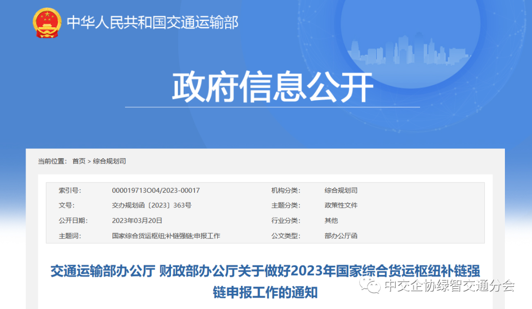 近日,交通运输部办公厅、财政部办公厅联合印发《关于做好2023年国家综合货运枢纽补链强链申报工作的通知》,明确总体要求和工作重点,对方案编制和项目遴选提出要求,进一步做好国家综合货运枢纽补链强链工作,加快建设高质量国家综合立体交通网。