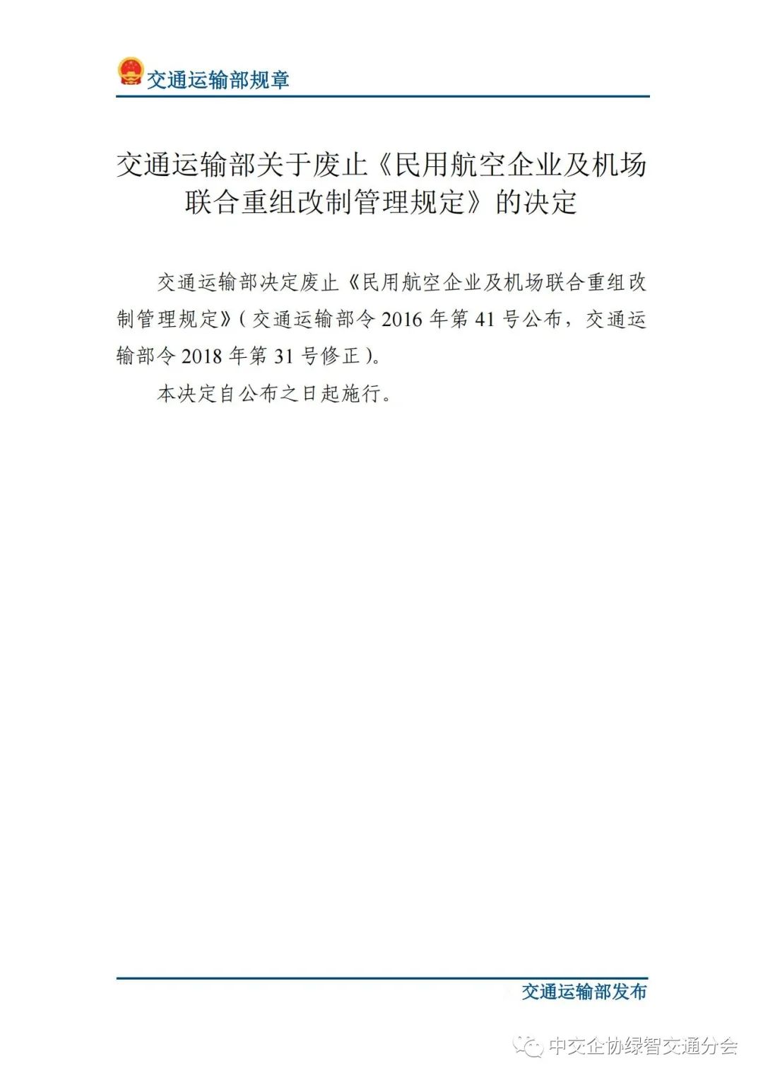 日前,交通运输部公布关于废止《民用航空企业及机场联合重组改制管理规定》(交通运输部令2016年第41号,以下简称《规定》)的决定,自公布之日起施行。