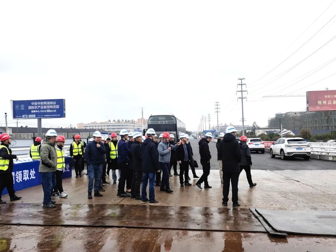 随后,参会人员前往荆州斜拉桥项目进行现场观摩学习。在荆州斜拉桥项目施工现场,项目总工介绍了项目的基本情况,讲解了钢结构斜拉桥施工工序、焊接施工方法及施工质量控制要点,分享了项目在施工过程中遇到的技术质量问题、经验教训及技术成果。