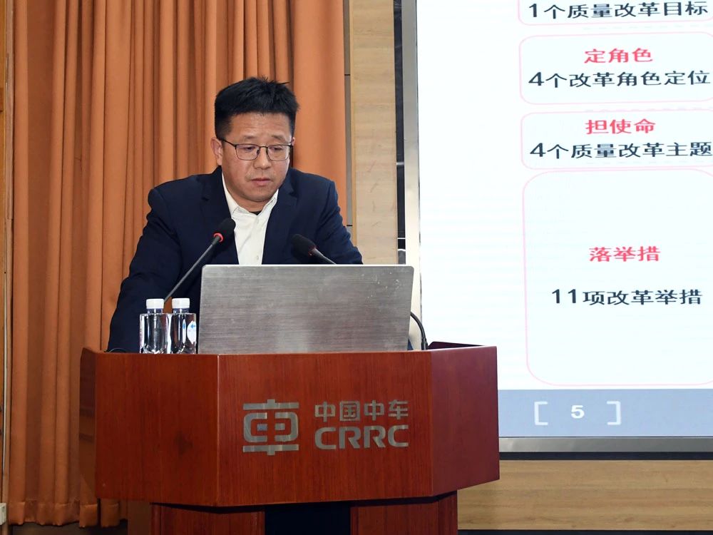 周军年在讲话中,就改革的目的和意义、方向和目标与全体与会人员进行分享交流。针对改革创新下一步工作,周军年提出四点要求:一要全面准确贯彻落实“两个一以贯之”的重要指示要求,在完善公司治理中进一步加强党的领导,确保党委领导作用实质性发挥。二要全面增强核心功能,打造核心竞争力。要打造三大核心竞争力,以科技创新引领、形成产品优势、培养专业人才、打造公司品牌。要坚定构建“轨道交通+战新产业”双赛道双集群产业布局。三要全面建设“制造、服务、多元、数智”四维唐车。围绕四维唐车建设开展业务转型、管理转型以及体制机制改革支撑。四要统筹策划,稳中求进,以“同舟共济”的协作感坚定实施公司改革。要坚持稳中求进、试点先行。坚持目标导向,做好顶层规划;坚持问题导向,做好过程跟踪;聚焦成果导向,做好结果评价。要坚持统筹推进、协同创新。坚持党的领导,坚持战略引领,坚持全面协同,汇聚推动高质量发展的强大合力。2024年是公司向“十四五”战略目标发起冲锋的“突破年”,周军年号召全体员工要统一思想、坚定信心,牢牢把握国企改革深化提升行动契机,高质量实施公司改革,打造“绿色低碳”“全生命周期”“数字化”三大核心竞争力,构建“双赛道双集群”四维唐车新格局,开启公司高质量可持续发展新篇章,为将公司建设成为世界一流绿色、智能、人文轨道交通装备数字化服务型制造商努力奋斗!
