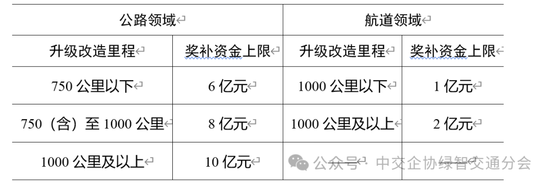 财政部根据竞争性评审确定的年度支持名单和交通运输部提出的资金安排建议,结合财力情况,按照“奖补结合”方式安排资金。其中公路、航道领域奖补资金分别核定,按照交通运输部核定总投资的一定比例予以奖补,东部、中部、西部地区奖补比例分别为40%、50%、60%。实施第一年按照每个示范区域奖补资金的40%予以补助,用于启动相关工作;后续根据绩效评价结果予以奖励。实施期内奖补资金具体根据各省份开展的公路、航道数字化升级改造里程规模确定,如下表所示。