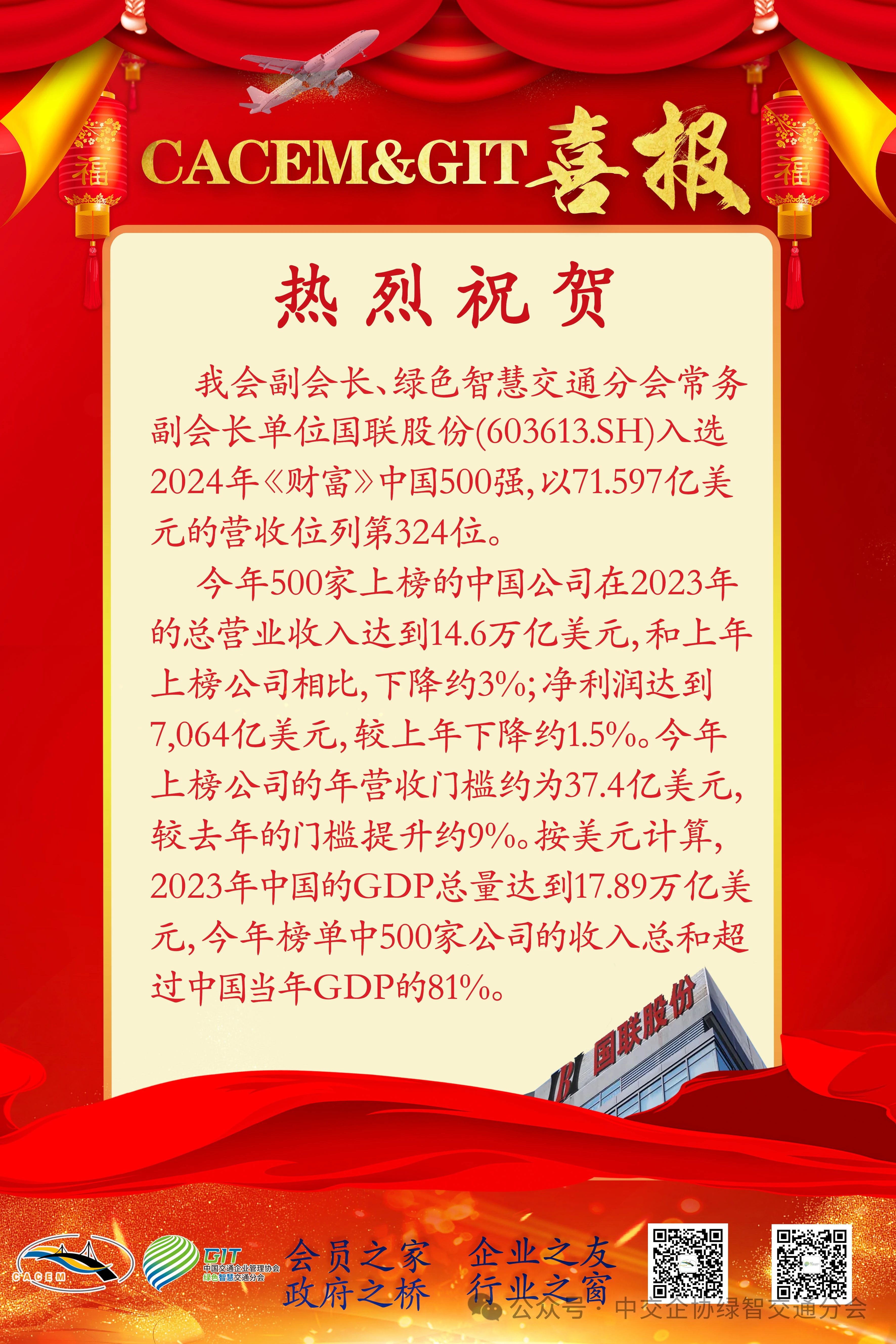 热烈祝贺我会常务副会长单位IBI国联股份入选2024年《财富》中国500强,以71.597亿美元的营收位列第324位