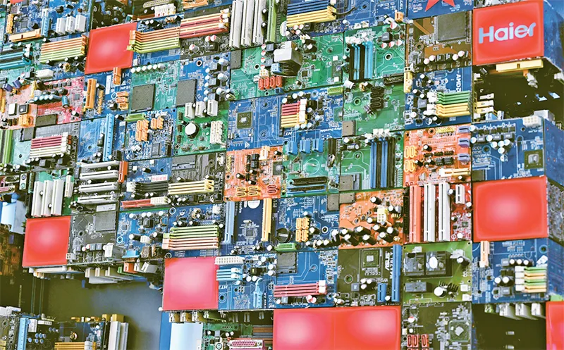 我国实施全面节约战略,大力发展循环经济。图为2024年9月27日,在海尔绿色再循环互联工厂展厅内拍摄的用废旧电路板制作的装饰墙。海尔绿色再循环互联工厂每年可拆解废旧家电200万台,再生循环新材料约3万吨。 新华社记者 李紫恒/摄