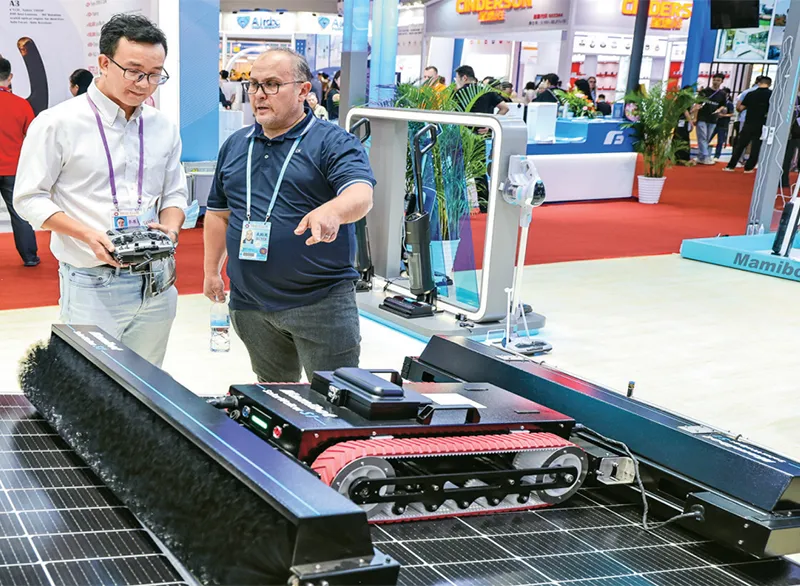 党的十八大以来,我国以年均3.3%的能源消费增速支撑了年均6.1%的经济增长,能耗强度累计下降26.1%,是全球能耗强度降低最快的国家之一。图为2024年10月15日,采购商在第136届广交会展馆了解一款太阳能面板自动清洁机器人产品。 新华社记者 刘大伟/摄