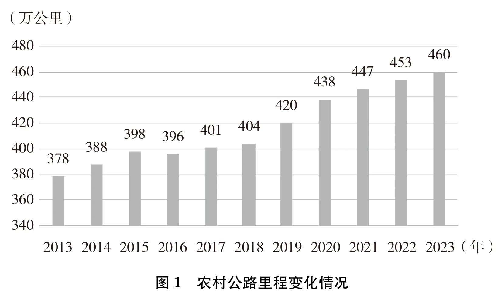 里程规模显著增长。十年来,新改建农村公路250余万公里。截至2023年底,农村公路总里程达到460万公里,长度可绕地球赤道115圈,十年间增长21.7%。县道、乡道、村道里程分别达到70万公里、124万公里、266万公里。农村公路桥梁达到53万座、隧道2222座。形成了一张县道沟通城乡、乡道往来交织、村道抵田连户的农村交通基础设施网络。