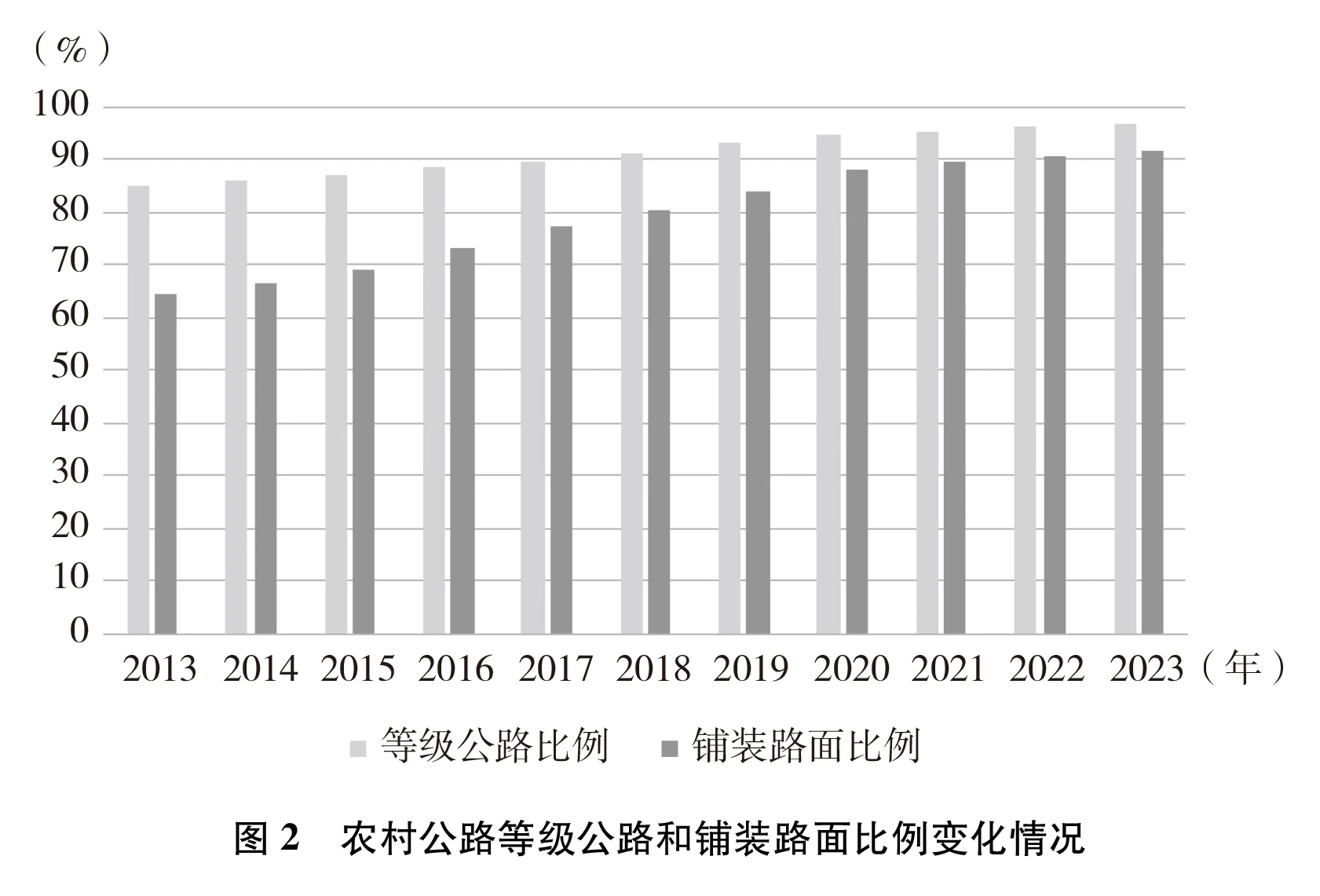 技术等级逐年提高。截至2023年底,农村公路等级路②里程及比例分别达到445万公里和96.8%,铺装路面里程及比例分别达到422万公里和91.8%,十年间分别提高了11.9个百分点、27.2个百分点。