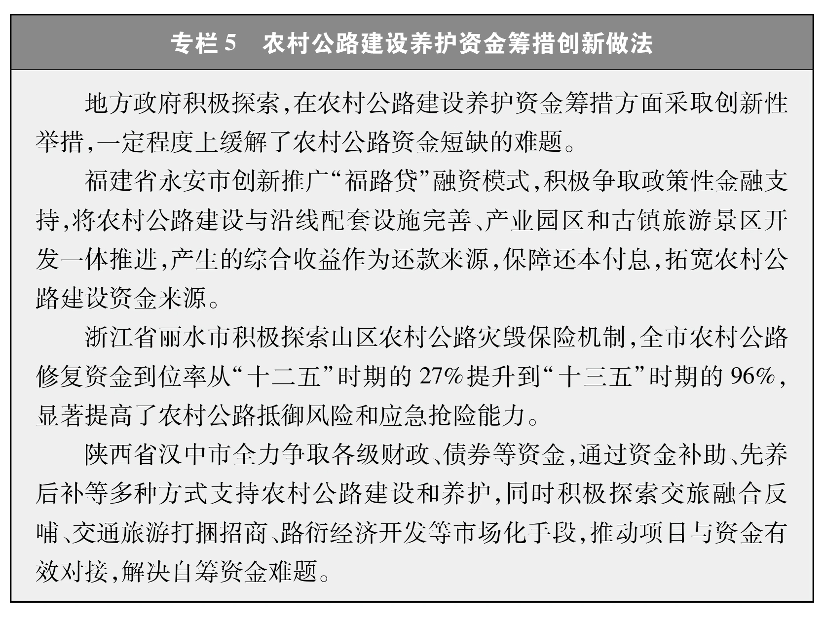 利用多元化市场融资方式拓宽融资渠道。充分发挥市场融资机制在农村公路发展中的重要作用,积极拓宽资金来源渠道。各地区结合实际,通过将农村公路与产业、园区、乡村旅游等经营性项目实行一体化开发等方式创新“农村公路+”投融资模式(专栏5)。通过将农村公路管养纳入政府购买服务指导性目录,探索农村公路灾毁保险等方式支持农村公路养护。鼓励各类金融机构依法合规加大对符合条件的农村公路建设的支持力度。十年来,全国累计使用各类金融机构信贷资金约8000亿元用于农村公路发展。