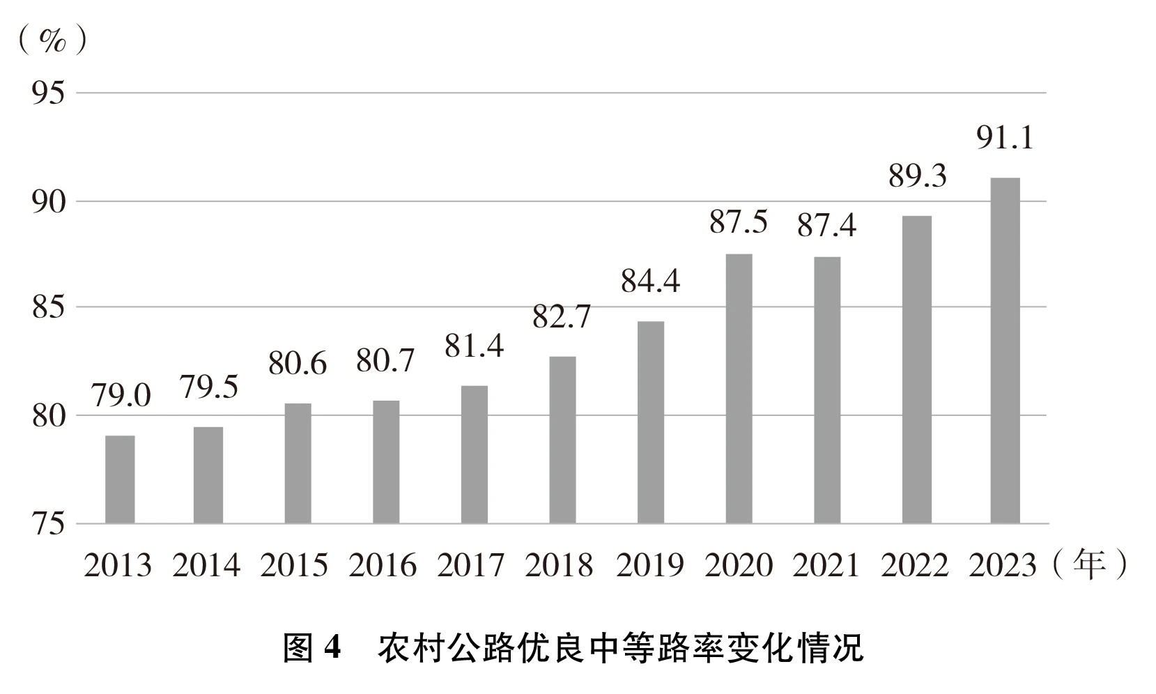 路况水平实现跨越式提升。持续加大养护投入,全面开展日常养护,大力实施养护工程,农村公路养护工程年均比例超5%。十年来,累计实施修复养护工程184万公里,优良中等路率④从79%上升至91.1%,基本实现“有路必养、养必到位”。