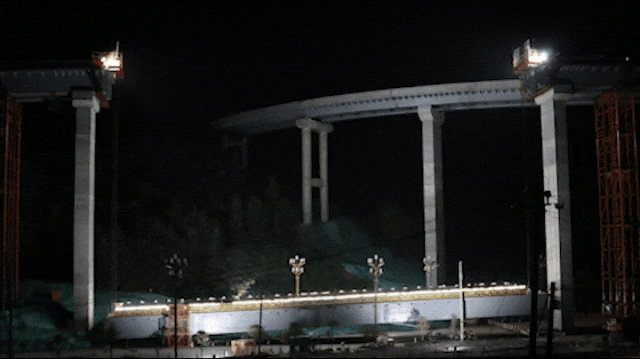 那坡枢纽互通是那平高速重点控制性工程之一,互通地形高差达50米。其中,那坡枢纽互通D匝道钢箱梁桥长达76米、重约443吨,采用广西路建集团研发的“结构物整体提升的姿态控制技术”进行悬臂整体提升。