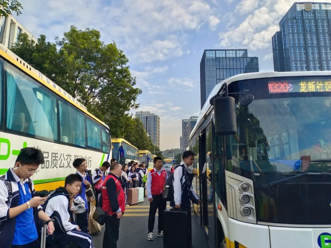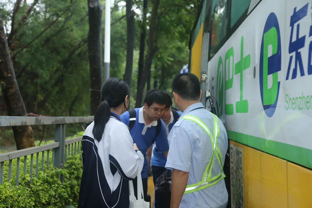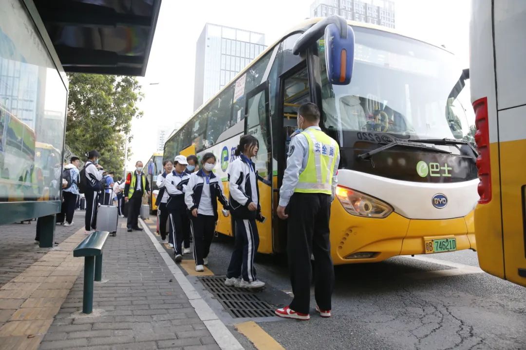以深圳高级中学高中园(坪地)为例,针对四所学校分批次放学、道路狭窄的情况,工作人员动态调整车辆调度,按片区排列线路号,手持引导牌核验身份并有序引导学生乘车。同时,对车辆严格执行全面消杀标准,驾驶员统一工装,展现出良好的精神风貌。规范服务获学校及家长高度认可。