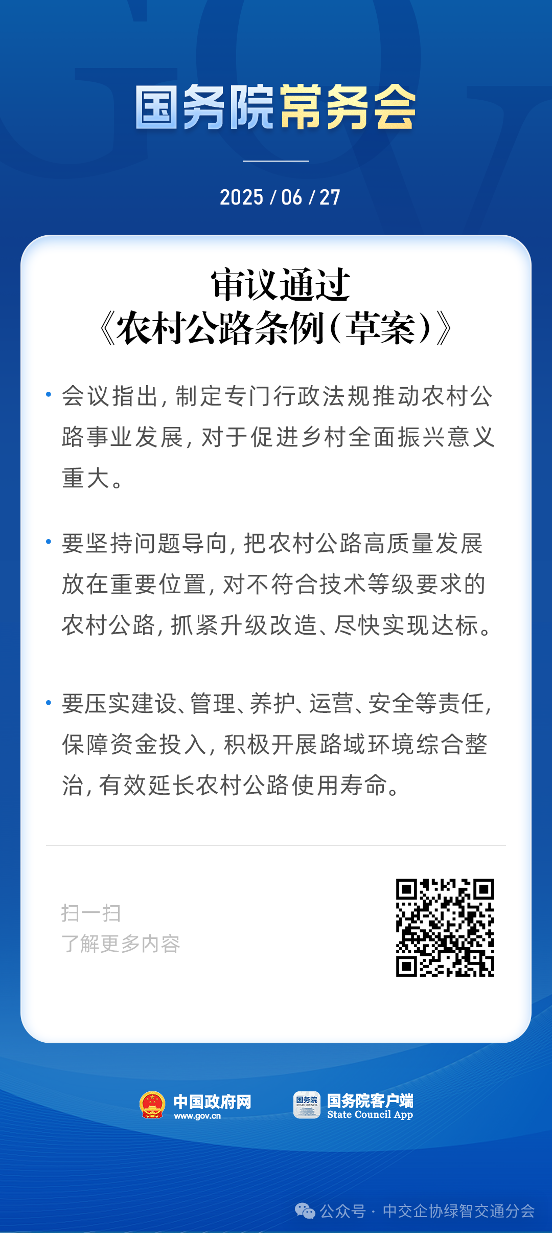 6月27日,国务院常务会议审议通过《农村公路条例(草案)》。《条例》将“四好农村路”经验、做法、要求以法规形式固化下来,将进一步强化农村公路建设、管理、养护、运营制度要求,从更高的层面、更全的维度规范农村公路建设、管理、养护、运营等工作。