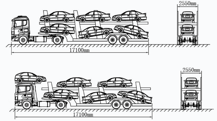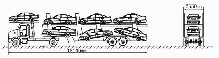 3.中置轴车辆运输车装载9辆以上的,严格执行装载长度不得超过22米、宽度不得超过2.55米、高度不得超过4米的要求。不符合要求的,公安交通管理部门依据《道路交通安全法》第九十条、《道路交通安全法实施条例》第五十四条规定,处警告或者二十元以上二百元以下罚款、记分,并根据《行政处罚法》第二十八条责令当事人改正违法行为。若装载乘用车车型较小,上层单排平放5辆车(不得上下左右倾斜)前后均不超过车辆运输车外廓尺寸的,可允许装载9辆车。