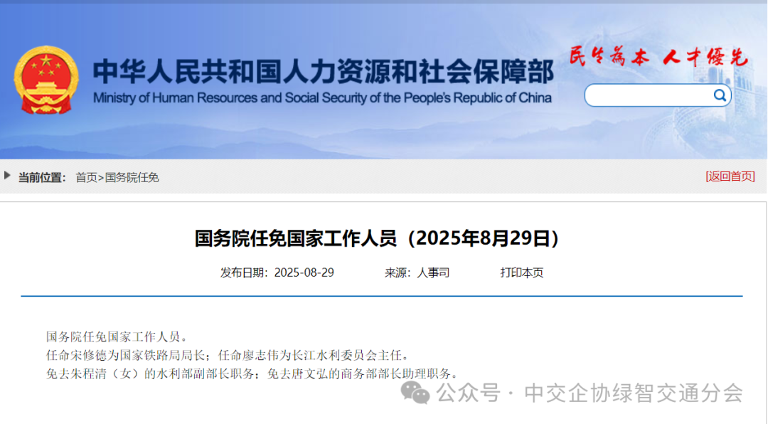人力资源和社会保障部网站8月29日消息,国务院任免国家工作人员,任命宋修德为国家铁路局局长。