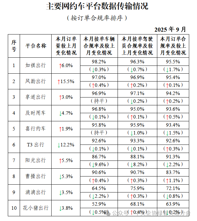 一、在订单量前10名的平台中,按订单合规率(指驾驶员和车辆均获得许可的订单量占比)从高到低的分别是如祺出行、风韵出行、享道出行、及时用车、喜行约车、T3出行、阳光出行、曹操出行、滴滴出行、花小猪出行。本月订单合规率增长前3名的依次是曹操出行、及时用车、T3出行;增长最后3名的依次是喜行约车(-1.5%)、如祺出行(-1.7%)、阳光出行(-2.2%)。