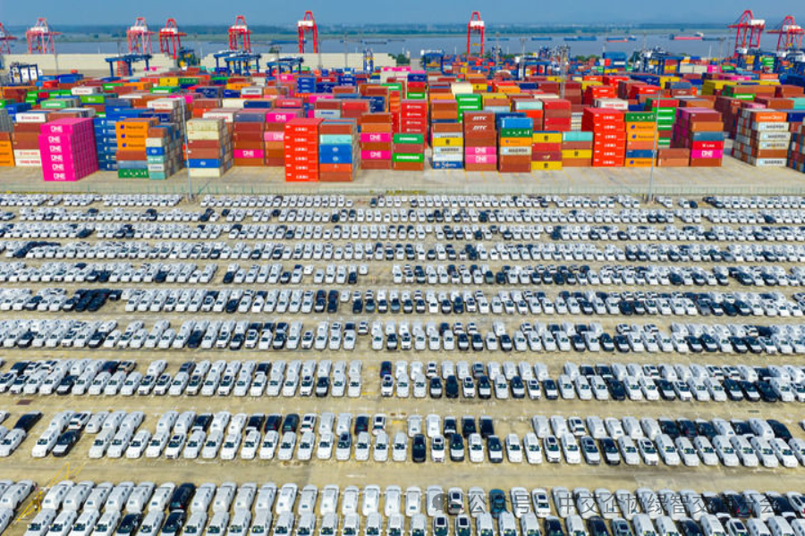2025年10月4日在江苏省港口集团南京港龙潭港区拍摄的准备装船出口的汽车(无人机照片)。新华社发(杨素平摄)