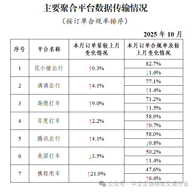 其中,面向乘客、与网约车平台公司共同提供服务的平台(俗称网约车聚合平台)完成2.77亿单,环比增长6.7%。按订单合规率从高到低分别是花小猪出行、滴滴出行、高德打车、百度打车、腾讯出行、美团打车、携程用车。