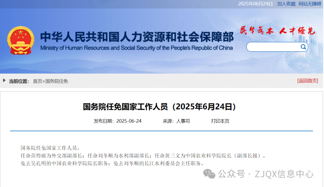 人事任免|苗得雨任外交部副部长、刘冬顺任水利部副部长、黄三文任中国农业科学院院长(副部长级)