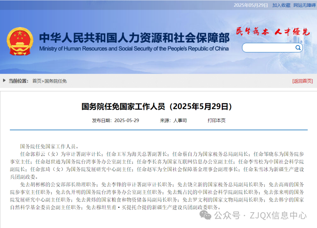 人事任免|审计署、海关总署、国家税务总局、国务院参事室、国务院台湾事务办公室、国家互联网信息办公室、中国社会科学院等一览表