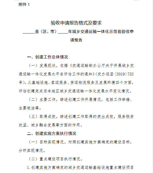 (一)创建县(区、市)人民政府申请。创建县(区、市)人民政府按要求对相关工作开展自查评估。经评估后具备验收条件的,由创建县(区、市)人民政府向所在地省级交通运输主管部门提出验收申请,并组织编制验收申请报告(格式及要求见附件1),报送省级交通运输主管部门审核。