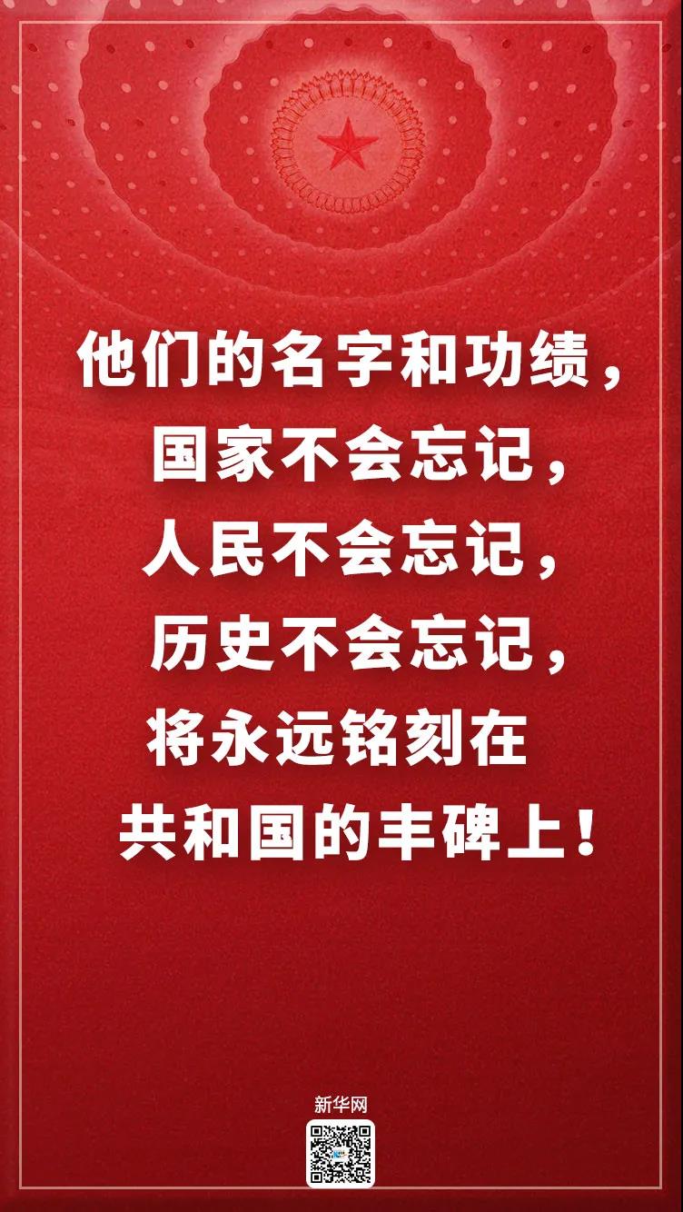 今天,我们隆重召开全国抗击新冠肺炎疫情表彰大会,向作出杰出贡献的功勋模范人物颁授共和国勋章和国家荣誉称号奖章,表彰抗疫先进个人和先进集体,弘扬伟大抗疫精神,为决胜全面建成小康社会、夺取新时代中国特色社会主义伟大胜利而不懈奋斗!