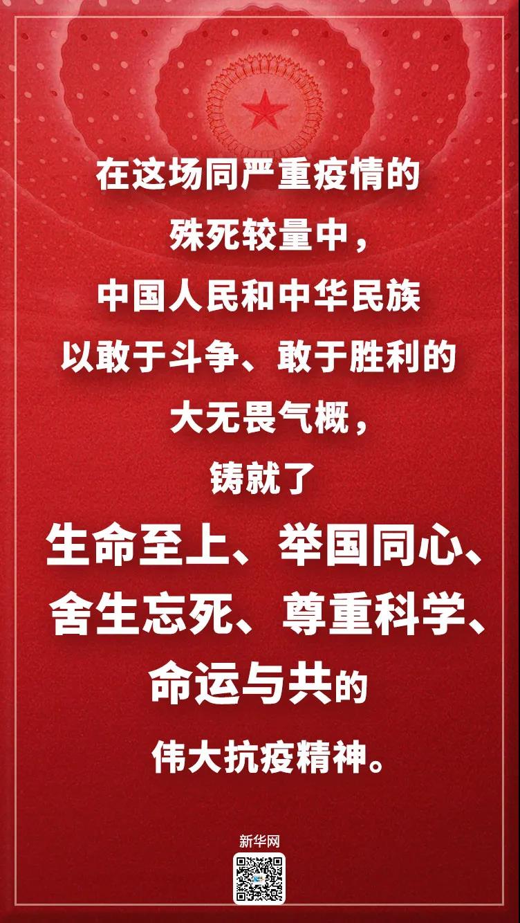 在这场同严重疫情的殊死较量中,中国人民和中华民族以敢于斗争、敢于胜利的大无畏气概,铸就了生命至上、举国同心、舍生忘死、尊重科学、命运与共的伟大抗疫精神。