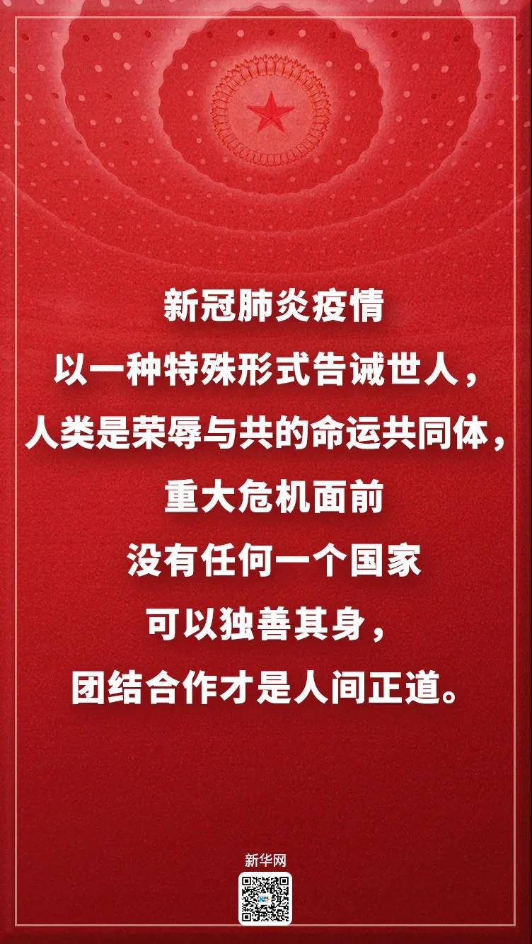 ——我们要秉持人类命运共同体理念,同国际社会携手应对日益严峻的全球性挑战。中国将继续推进疫情防控国际合作,支持世界卫生组织发挥全球抗疫领导作用,同各国分享防控和救治经验,继续向应对疫情能力薄弱的国家和地区提供帮助,发挥全球抗疫物资最大供应国作用,推动构建人类卫生健康共同体。我们将拓展同世界各国的互利互惠合作,继续推进经济全球化,坚定维护多边贸易体制,维护全球产业链供应链安全畅通运转,共同推动世界经济早日重现繁荣。我们愿同各国一道推动形成更加包容的全球治理、更加有效的多边机制、更加积极的区域合作,共同应对地区争端和恐怖主义、气候变化、网络安全、生物安全等全球性问题,共同创造人类更加美好的未来。