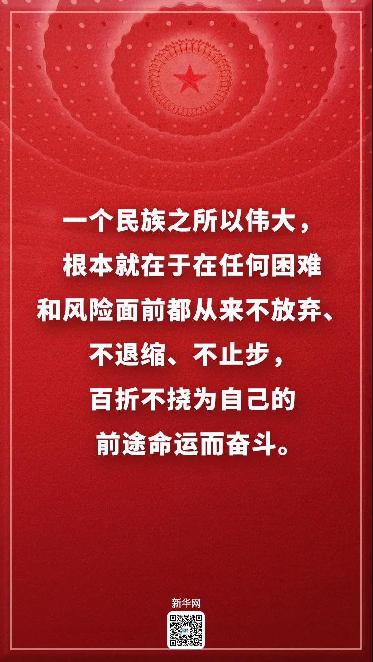 “天行健,君子以自强不息。”一个民族之所以伟大,根本就在于在任何困难和风险面前都从来不放弃、不退缩、不止步,百折不挠为自己的前途命运而奋斗。从5000多年文明发展的苦难辉煌中走来的中国人民和中华民族,必将在新时代的伟大征程上一路向前,任何人任何势力都不能阻挡中国人民实现更加美好生活的前进步伐!