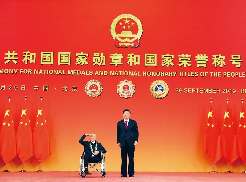 2019年9月29日,中华人民共和国国家勋章和国家荣誉称号颁授仪式在北京人民大会堂金色大厅隆重举行。中共中央总书记、国家主席、中央军委主席习近平向“共和国勋章”获得者张富清颁授勋章。新华社记者 王晔 摄