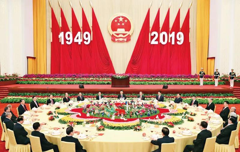 2019年9月30日晚,庆祝中华人民共和国成立70周年招待会在北京人民大会堂隆重举行。习近平、李克强、栗战书、汪洋、王沪宁、赵乐际、韩正、王岐山等党和国家领导人与4000余名中外人士欢聚一堂,共庆新中国70华诞。新华社记者 黄敬文 摄
