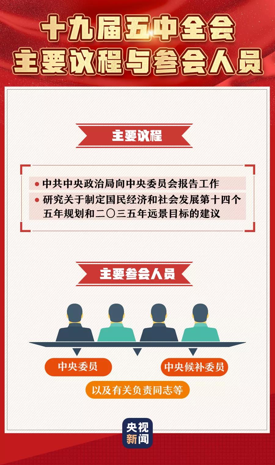 中国共产党第十九届中央委员会第五次全体会议26日上午在京召开。中央委员会总书记习近平代表中央政治局向全会作工作报告,并就《中共中央关于制定国民经济和社会发展第十四个五年规划和二〇三五年远景目标的建议(讨论稿)》向全会作了说明。下面这组图带你了解十九届五中全会。