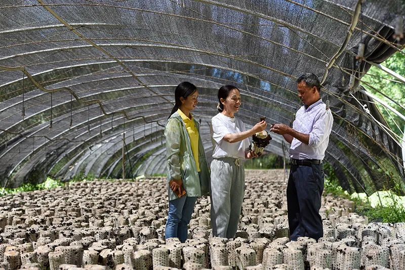 新疆维吾尔自治区党委组织部、老干部局驻托万克麦盖提村“访惠聚”工作队第一书记陈双萍(中)和工作队员来到生态园与技术员陈金生(右)查看培育的木耳(2022年6月7日摄)。新华社记者 丁磊 摄