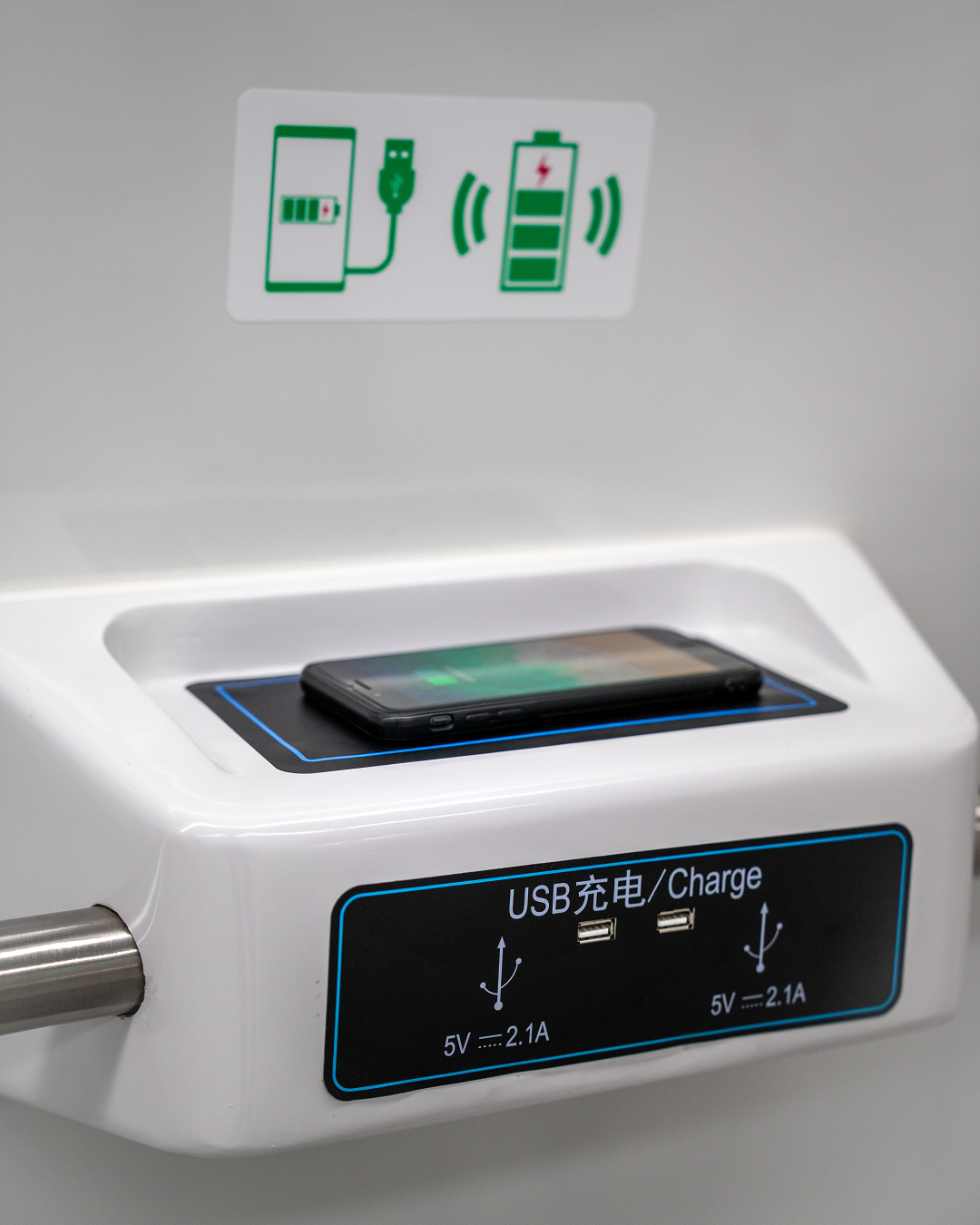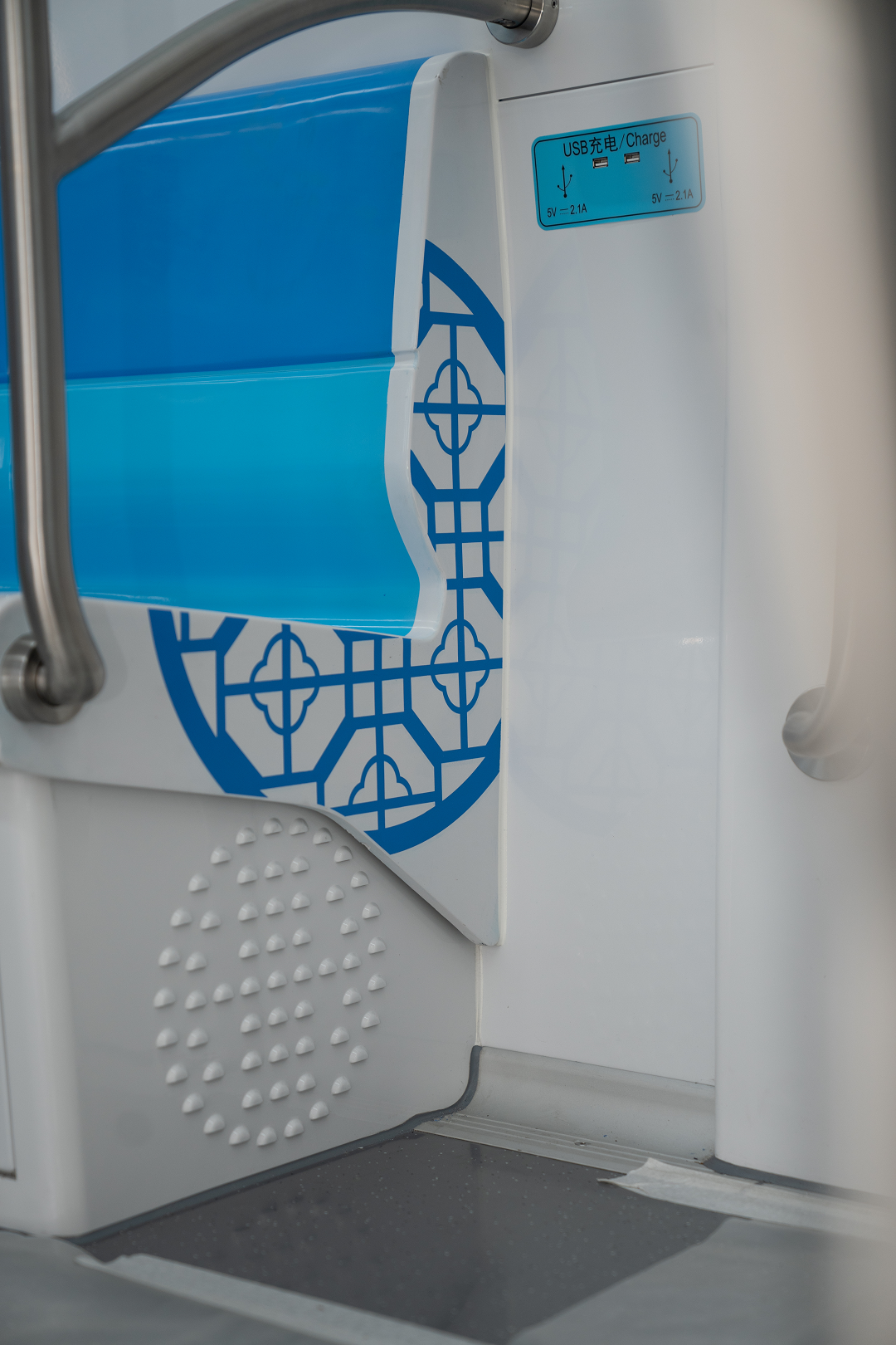04 新功能 更人性车厢内部采用48"LCD动态地图、高屏占比的超薄LCD显示屏以及大尺寸端部目的地显示屏,多方位提供乘车信息指示。客室座椅端部与司机室靠扶位置新增手机充电装置,可为乘客提供有线及无线两种模式充电服务。列车还采用无级恒照度调光控制的LED照明系统,在降低能耗的同时也能显著提升乘坐舒适性。