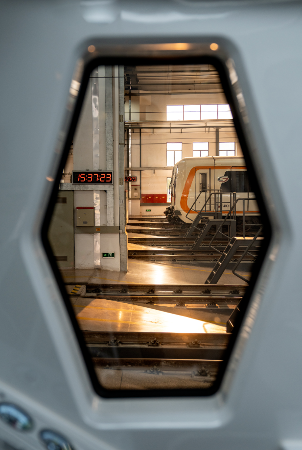 02 敞开式 更融合苏州轨道交通6号线司机室区域为敞开式设计,与客室空间融合贯通,内饰、照明、通风系统也与客室融为一体。司机室区域设置隐藏式软隔断,在特殊情况下可快速打开,隔离出独立的司机室操作空间。司机室前端设置带通透玻璃的一体式紧急疏散门,门边配置紧急对讲装置,增加了列车的应急处置手段。