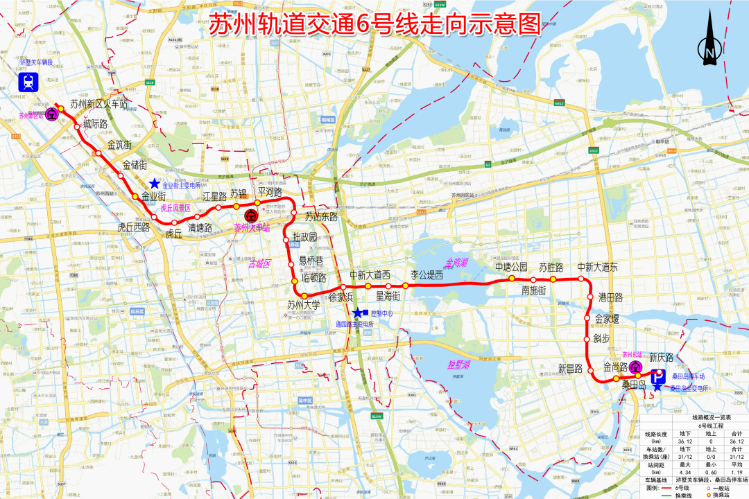 苏州轨道交通6号线起于苏州新区火车站,终于桑田岛站,全长36.12公里,设站31座,是连接虎丘区、姑苏区、苏州工业园区的重要干线枢纽,建成后将进一步强化金鸡湖两岸的联系,也将成为城市东西向穿越古城及金鸡湖的重要客流通道,对于促进苏州新老区经济互融、城际客流的集散有着重要意义。