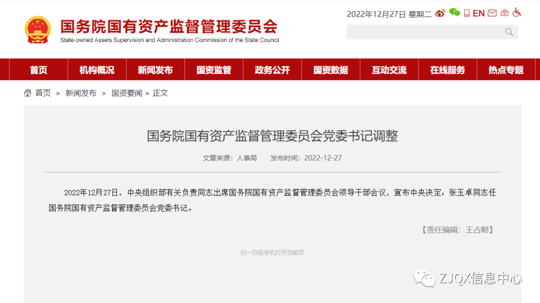 2022年12月27日,中央组织部有关负责同志出席国务院国有资产监督管理委员会领导干部会议,宣布中央决定:张玉卓同志任国务院国有资产监督管理委员会党委书记。