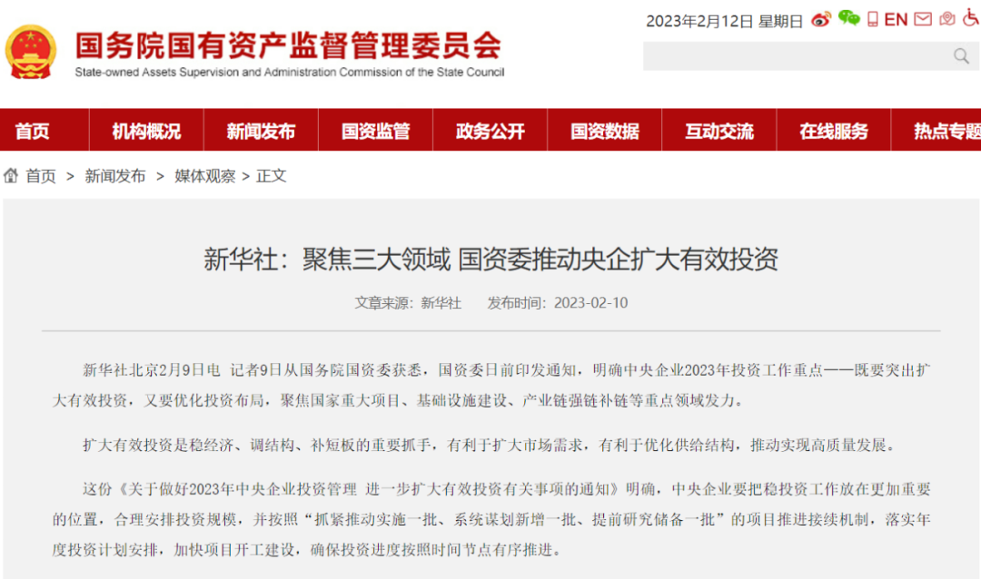日前,国务院国资委印发《关于做好2023年中央企业投资管理 进一步扩大有效投资有关事项的通知》(以下简称《通知》),明确中央企业2023年投资工作三大重点领域:国家重大项目、基础设施建设、产业链强链补链。