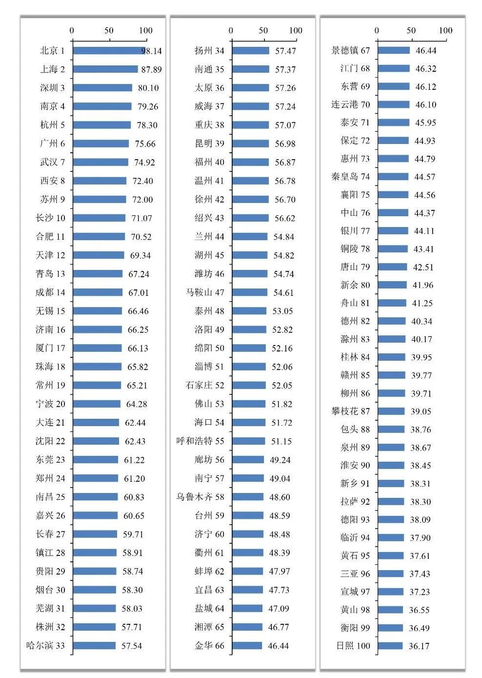 2023年是该系列报告的第四次公布。由于数据可获得性及城市、城区之间的可比性问题,编写组仅对97个地级和副省级国家创新型城市的创新能力进行评价。“根据党的二十大精神、政府统计制度变化等最新情况,报告对部分指标进行调整,增加了万人普通高校在校学生数、高层次科技人才数等指标。”中国科学技术信息研究所党委书记赵志耘说,这是为了引导城市将教育、科技、人才事业一体化部署、一体化推进,形成创新型城市建设的战略性支撑。