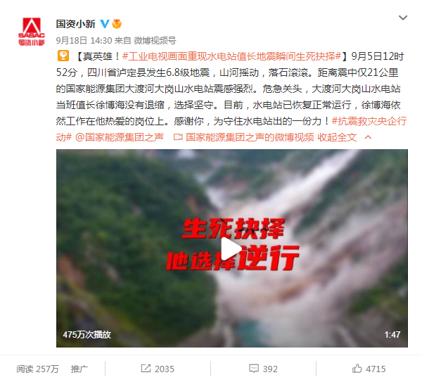 在抗震救灾过程中,也涌现出一批感人事迹:地震来临瞬间,为了电网安全和下游多个城镇安全,国家能源集团大渡河大岗山水电站当班值长徐博海没有丝毫犹豫,逆行跑向应急指挥室坚守岗位;地震后,为尽快开辟救援通道,四川路桥集团的两名操作员挖掘机手王令和装载机手唐鑫,争分夺秒在半山腰上施工,凭借高超技艺,于绝壁上打通“生命通道”……国有企业“国家队”勇往直前、逆行而上的动人身影,打动无数网友。