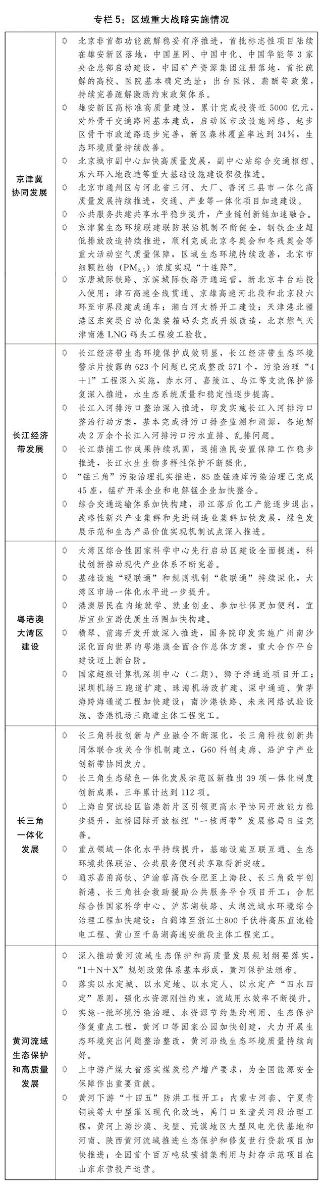 一是区域重大战略扎实推进。京津冀协同发展水平不断提升,一批央企、医院、高校等疏解项目在雄安新区落地,津冀港口群基础设施不断完善,“轨道上的京津冀”更加便捷。长江经济带绿色高质量发展有力推进,长江保护法深入贯彻实施,生态环境突出问题整改、污染治理“4+1”工程成效明显,入河排污口整治等专项行动深入实施,长江流域重点水域十年禁渔进展良好。大湾区综合性国家科学中心先行启动区加快建设,设施联通和规则衔接不断深化,横琴、前海、南沙、河套等重大合作平台建设深入推进。积极推动长三角科创与产业融合发展,G60科创走廊、沿沪宁产业创新带协同发力的创新空间布局不断优化,基础设施、生态环境、公共服务等重点领域一体化水平明显提升。黄河流域生态环境保护、水安全保障、文化保护传承弘扬等专项规划出台实施,黄河流域生态保护和高质量发展先行区加快建设,黄河生态保护治理五大攻坚行动稳步推进。
