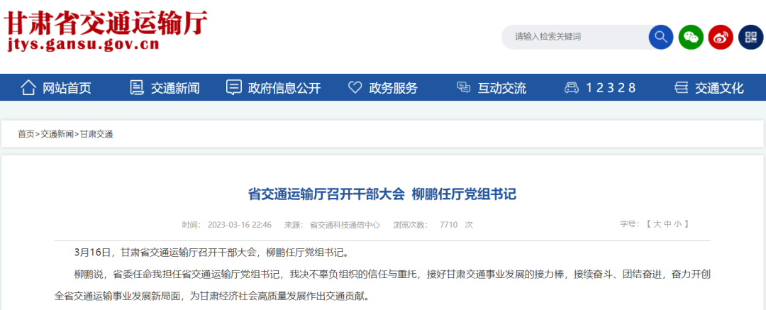 3月16日,甘肃省交通运输厅召开干部大会,柳鹏任甘肃省交通运输厅党组书记。